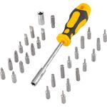 Contém: 1 Jogo de bits/ponteiras, composto por um estojo plástico com 29 peças, sendo: 1 cabo com encaixe sextavado, 1 adaptador, 1 soquete, 5 fenda (3 mm, 4 mm, 5 mm, 6 mm e 7 mm), 3 phillips (nº 0, nº 2 e nº 3), 4 pozidrive (nº 0, nº 1, nº 2 e nº 3), 6 hexalobular (T10, T15, T20, T25, T30 e T40), 2 quadrados S1 (2 mm) e S2 (3 mm) e 6 sextavados (2 mm, 3 mm, 4 mm, 5 mm, 5,5 mm e 6 mm)