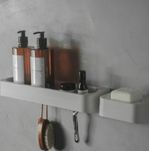 Com rebaixo integrado, mantém frascos seguros e evita quedas, enquanto os ganchos interno discretos permitem pendurar esponjas, escovas de banho e lâminas de barbear. Sua base facilita o escoamento de água.